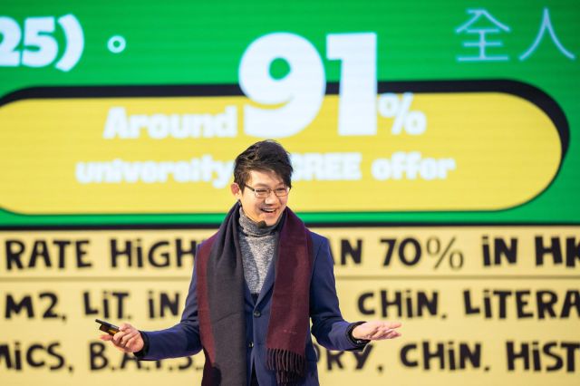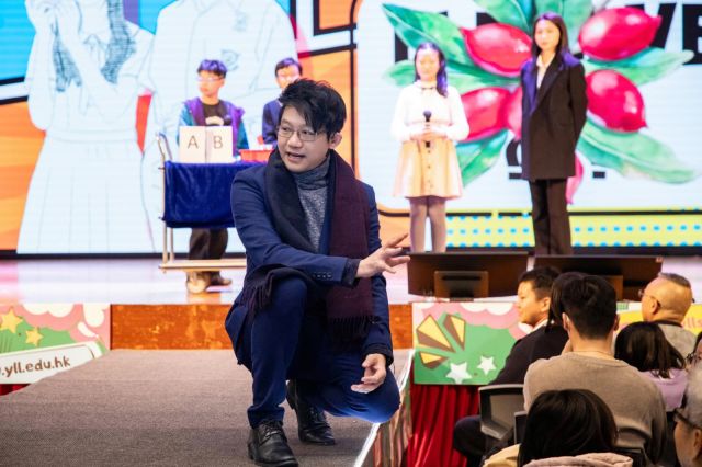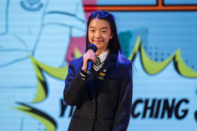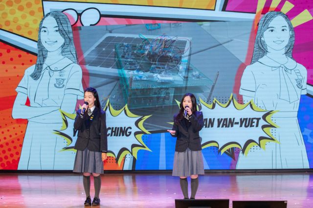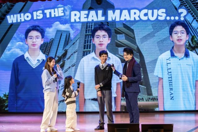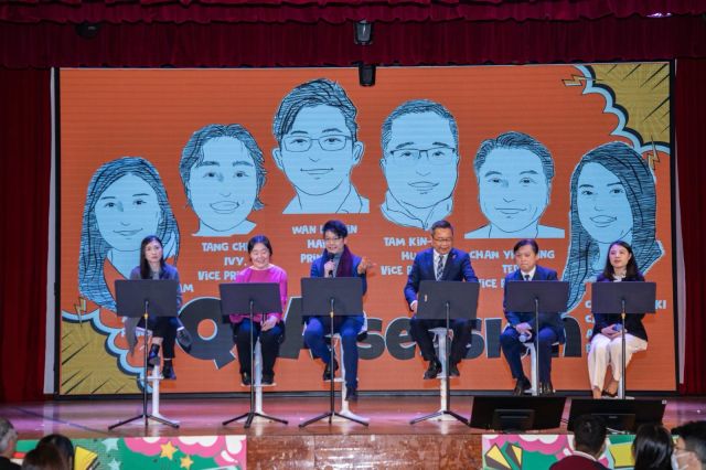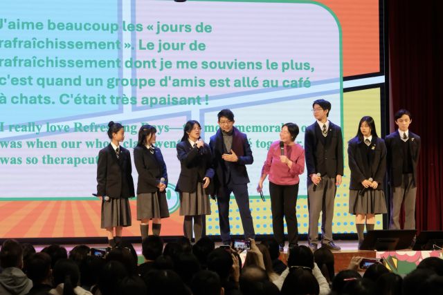 尹校長提到「駕馭科技」,不是沉迷手機,而是善用科技促進成長!現場他更與Marcus媽媽及妹妹玩遊戲,猜出真正Marcus(2E班鄧浚堯),而非AI替身,全場笑聲不斷。校長進一步介紹學校如何推動用AI創新學習,如AI Marking批改中英文作文、Moodle AI隨時隨地訓練演講,讓學生享有更多自主學習空間,成長更快。他深信學生們善用科技一定能閃耀光芒!