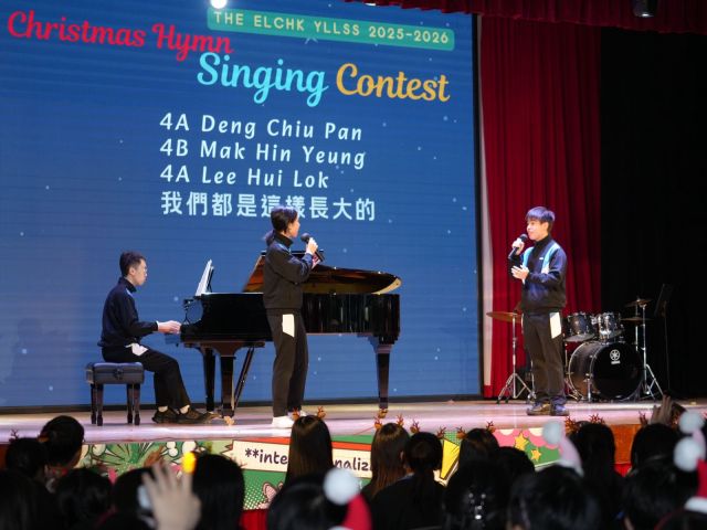 一年一度的音樂比賽又來啦!初中歌唱比賽由2C陳希彤、2D黃婧及3D黃皓駿擔任學生司儀,高中歌唱比賽由5C梁欣曈、5C杜穎潼及5B梁雨軒擔任學生司儀。特別感謝評判尹浩然校長、葉君教師及家長教師會委員鄧佩兒女士的辛勤付出。相信每位參賽同學的傾力演出都打動了在場的每位觀眾,使這場比賽充滿了歡樂與感動。無論賽果如何,你們在台上發光發亮的模樣都贏盡了掌聲,希望各位同學能繼續保持對音樂的熱愛。